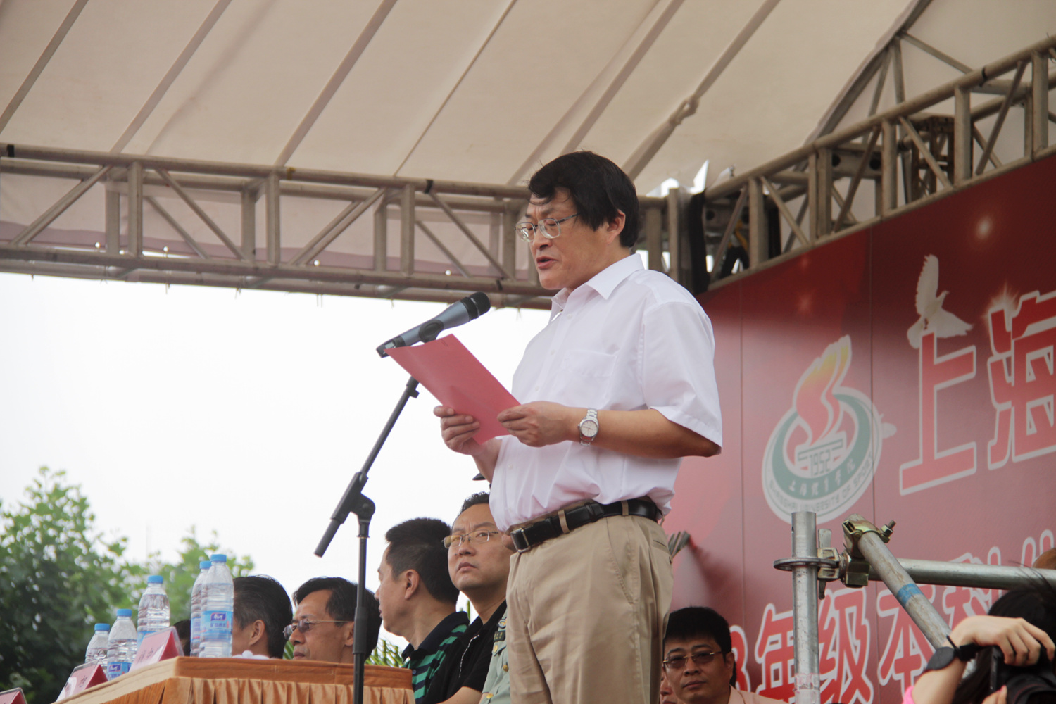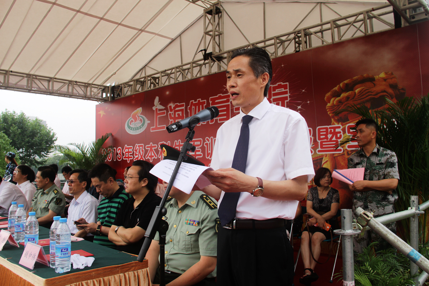 表演结束后,军训工作领导小组组长陈晓峰作军训总结发言。他代表全院师生向为军训工作作出重大贡献的带训部队官兵表示感谢,同时向2013年级990名通过军训锻炼的同学们表示祝贺。陈晓峰认为今年军训工作目标明、方向正、管理严、效果好。在教官的悉心指导下,同学们初步掌握了一定的军事技能,加强了组织纪律性,增强了吃苦耐劳的精神和顽强的意志。这将成为同学们今后一笔宝贵的精神财富。此次军训正值梅雨季节,今年军训工作预案在先,制定了应对高温、雨天的紧急预案,并且行动到位,加之后勤的有力支撑,为今年军训工作圆满顺利完成保驾护航。陈书记希望同学们以军训为起点,继续巩固和发扬集体主义精神,学习上互帮互助,生活中互相关心,珍惜大学时光,秉承上海体育学院“身心一统,兼蓄竞攀”的校训精神,传承和发扬上体精神。
