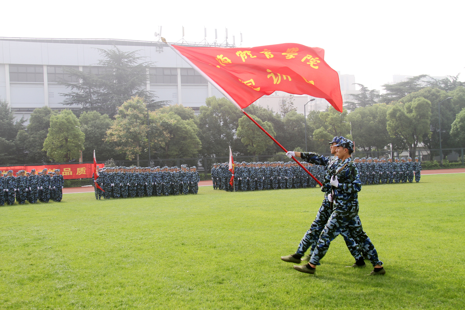 党委书记戴健,党委副书记、副院长陈晓峰以及军训团团长钱中伟对所有参加阅兵式的队伍进行检阅,检阅完毕,各支队伍开始分列式表演。仪仗队是分列式的第一个方阵,他们英姿挺拔,步伐坚毅,展现了军人的风采和尊严。随后上场的是持枪方阵。该方阵的战士们激情昂扬、奋勇向前,是绿瓦学子的抖擞风貌和军人坚韧不拔、不屈不挠精神的最好结合。持枪方阵过后是口号响亮、步伐整齐的各支连队,各连队踏着《中国人民解放军军歌》的乐曲豪迈地经过主席台前,以饱满的精神以及昂扬的斗志接受领导的检阅。