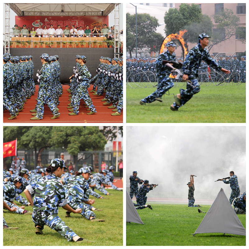 阅兵式后进行的是军训汇报表演。首先出场的是女子军体拳表演。巾帼英雄们队列整齐,英气逼人,矫健的动作向我们证明“谁说女子不如男”。随后是男子刺杀操表演,他们的呐喊声响彻云霄,他们的招式刚劲有力,淋漓地展现了男人的刚猛之力与霸王之气。最后是步兵班进攻战斗演练,表演学生脸涂迷彩图案,匍匐前进、钻火圈、搏斗摔跤,一个个动作精彩纷呈,展现了他们的勇猛果敢,赢得了在场所有人的连连喝彩。