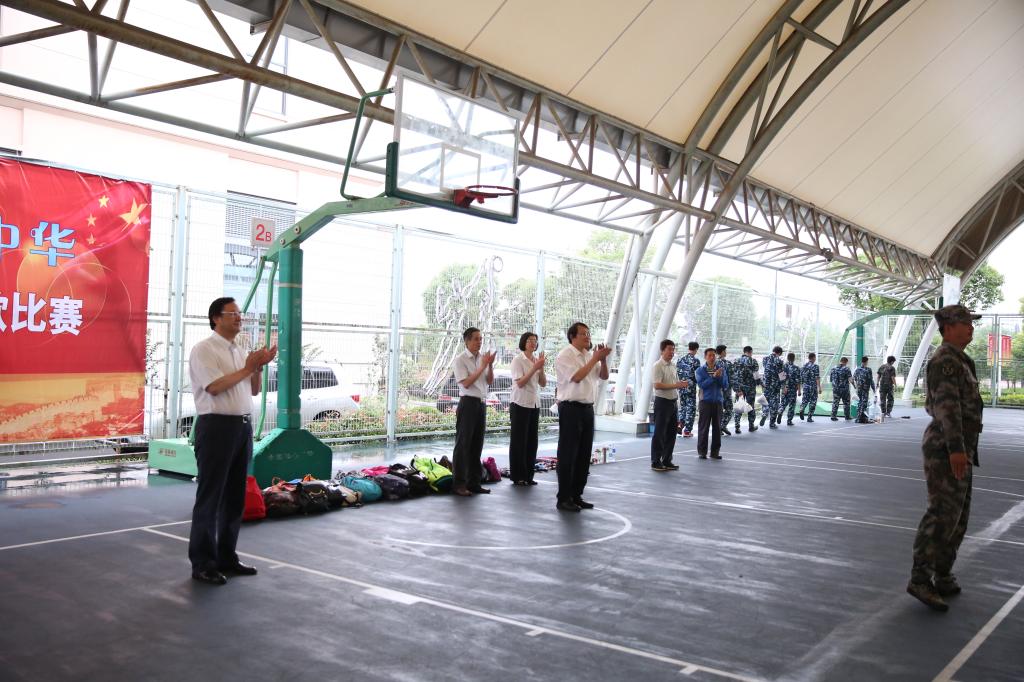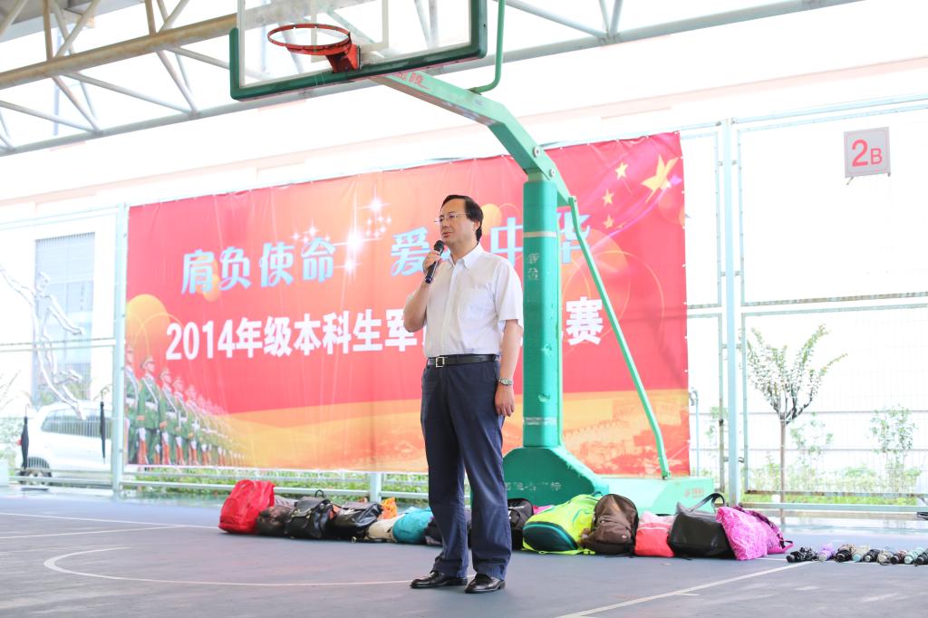 本网讯 7月6日,上午八点半,党委书记戴健、院长陈佩杰、党委副书记、副院长陈晓峰,党委副书记、纪委书记詹萌,副院长平杰、副院长施之皓等一行数人来到风雨篮球场,慰问在此进行军训的2014年级全体本科生以及全体承训部队官兵。