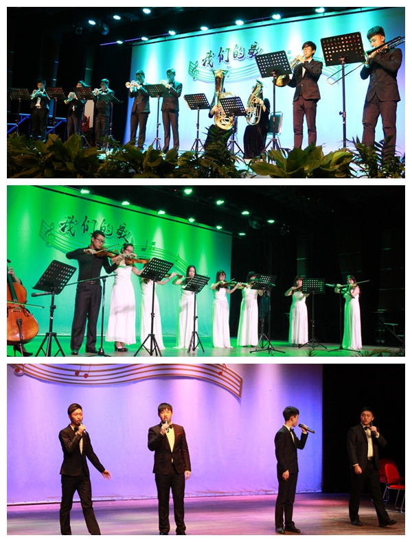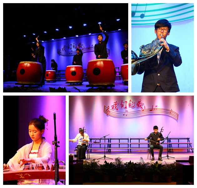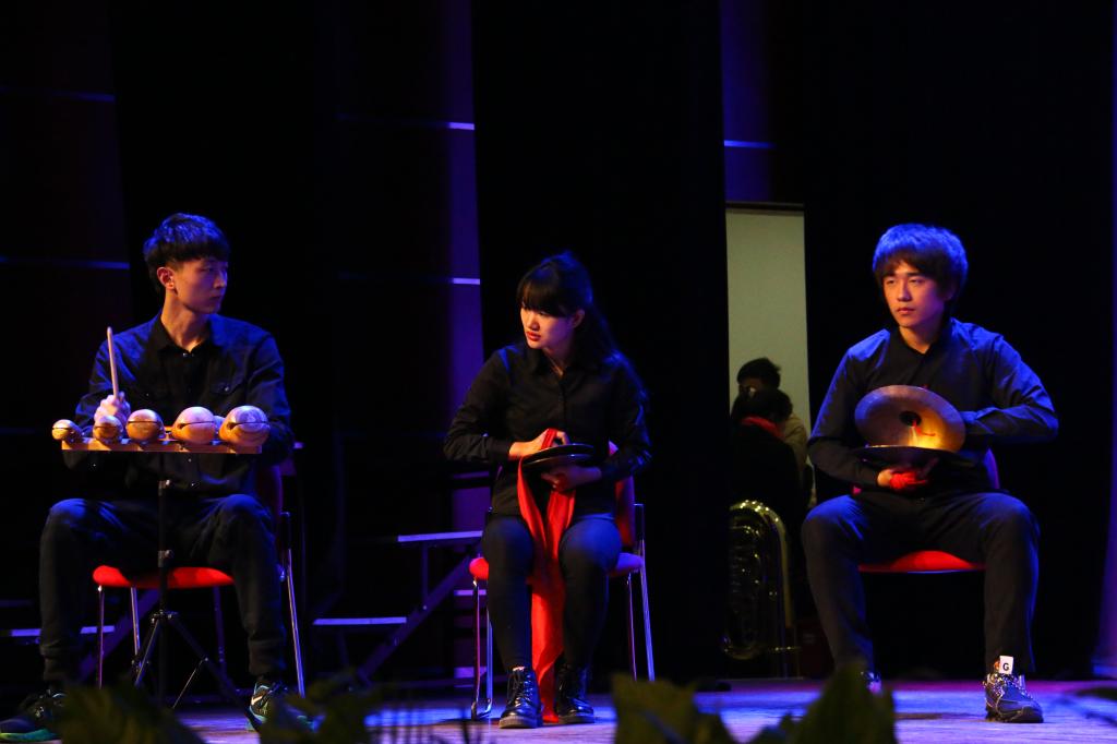 下半场在打击乐团的中国鼓重奏曲目《老虎磨牙》开场,用大鼓、锣、木鱼等乐器把“老虎”出场表演的惟妙惟肖。将晚会再一次推向高潮。而后是由管乐团带来的铜管小合奏《皇家进行曲》和《回旋摇滚》,乐团们整齐划一演奏颇好。弦乐队带来的弦乐合奏《权力的游戏》和《卡农》,音调时而低沉,时而高亢,时而欢快,令人回味无穷。民乐队带来的古筝独奏《春到湘江》,娴熟的技巧,优美的动作也是晚会一大亮点。和由合唱团带来的男生四重唱《Do you hear the people sing?》是百老汇音乐剧《悲惨世界》最为脍炙人口的插曲之一,整首插曲以激越昂然、不屈不挠的革命牺牲精神吸引了在场多数心怀热血与希望的观众与之共鸣。最后压轴表演是由管乐团带来的管乐合奏《荒野七骑士》《那些年》,气势磅礴的合奏和帅气的指挥老师再次引得全场喝彩,熟悉优美的旋律《那些年》勾起了在场所有人的美好回忆。