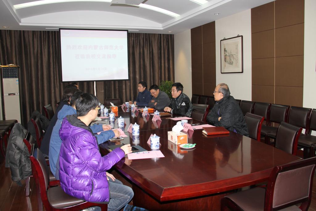 1月14日,内蒙古师范大学副校长张海峰,校长办公室主任霍日查、教务处处长王来喜、体育学院院长董建平等一行7人来访我校,就双方进一步合作事宜进行了交流探讨。副院长施之皓,学院办公室主任杨玲、教务处副处长(主持工作)唐炎、中乒院分党委副书记、副院长李汶凯、教务处副处长山广等共同接待了来访客人。