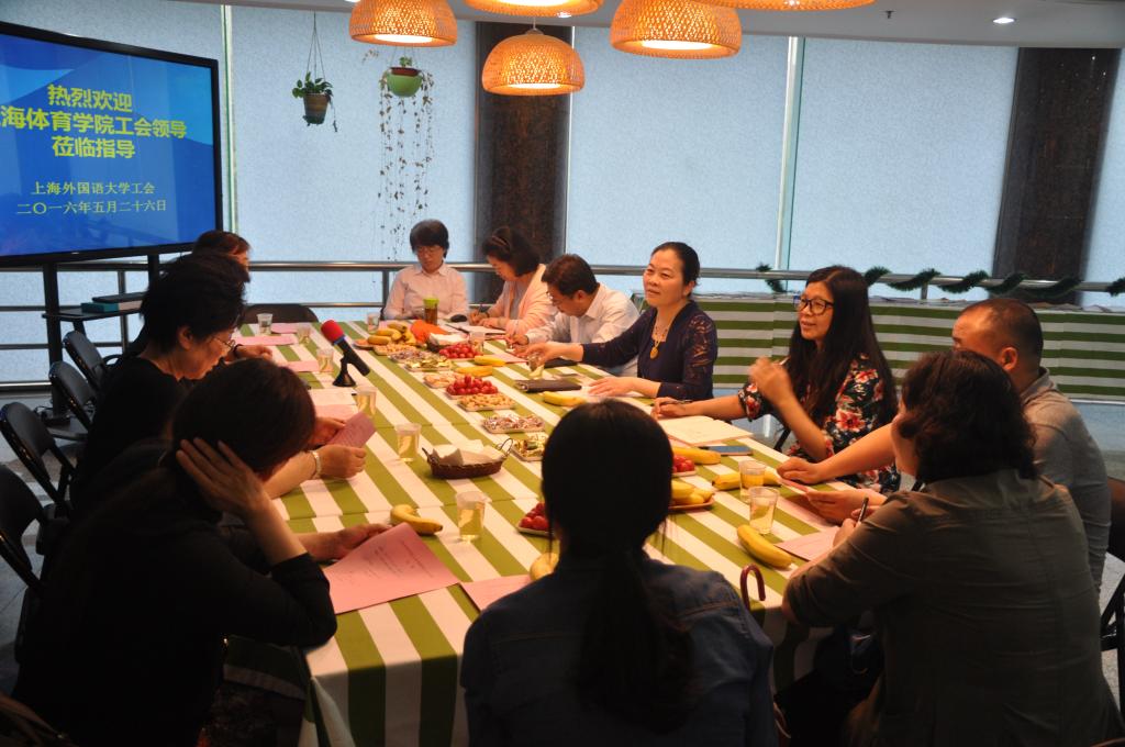 5月26日下午,上海体育学院第十三届工会委员、部门工会主席及教工文体协会骨干等一行10人专程赴上外工会学习交流。上外工会常务副主席、妇女工作委员会主任于朝晖教授,副主席、妇委会副主任顾蔚老师等热情接待了我们,双方进行了愉快融洽地工会工作经验交流和座谈,并实地参观了上外图书馆工会“妇女小家”“妈咪小屋”。座谈会由上外工会顾蔚老师主持。