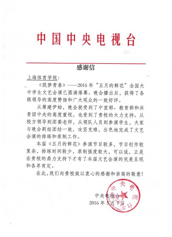 本网讯 5月4日,由中宣部、教育部、共青团中央联合主办,中央电视台一号演播大厅录制播出的“五月的鲜花”全国大学生文艺会演在央视一套、三套黄金时段播出,中宣部副部长景俊海、教育部副部长郝平、团中央书记处书记傅振邦亲临现场观看演出并作重要讲话,其中我校体育舞蹈表演团和花样跳绳队共同完成的舞蹈《五月的鲜花》作为全场第一个节目绚丽呈现,获得一致好评。日前,我校收到中央电视台发来的感谢信,对我校参演本次文艺会演活动的付出与支持表示感谢。