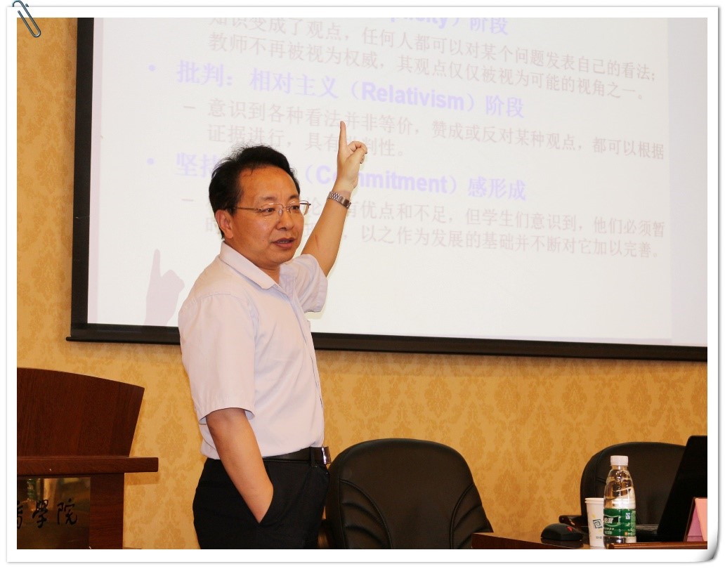 在两小时讲课中,庞教授首先通过教师教学能力和研究能力导入主题“大学生的发展需求和学习问题及教学策略”。紧接着,庞教授描述、分析了大学生在在大学四年中的智力、社会性、自我等发展阶段的需求,及目前网络、信息量大、智能手机等突出的学习问题,结合教学策略五大原理——以学生为中心原理,以学生原有知识为基础原理,环境支持、学习动机与学习价值交互原理,技能强化原理,学生主动构建知识原理提出两种教学策略——先行组织者教学策略和支架式教学。