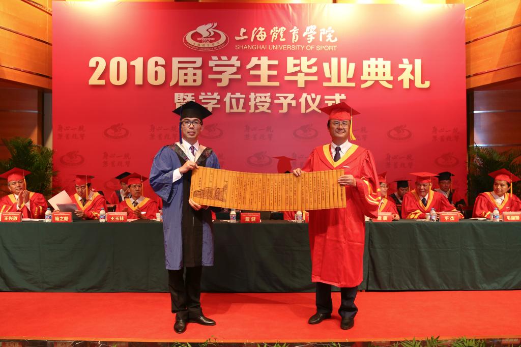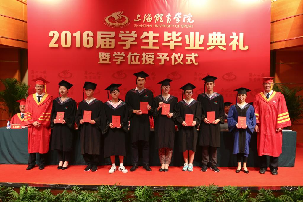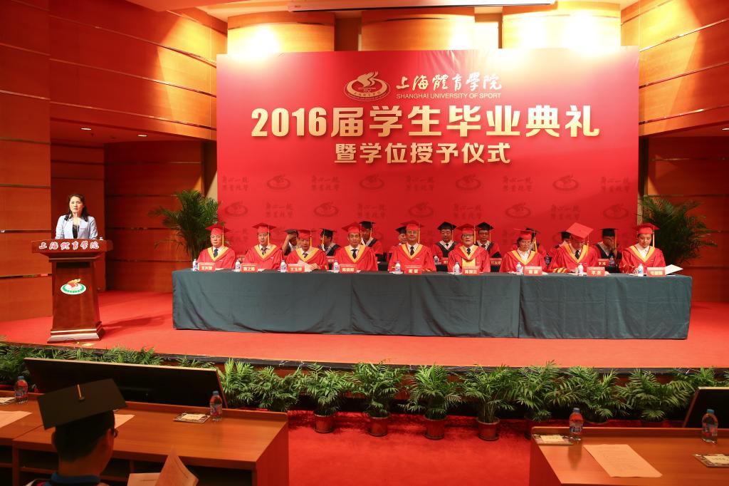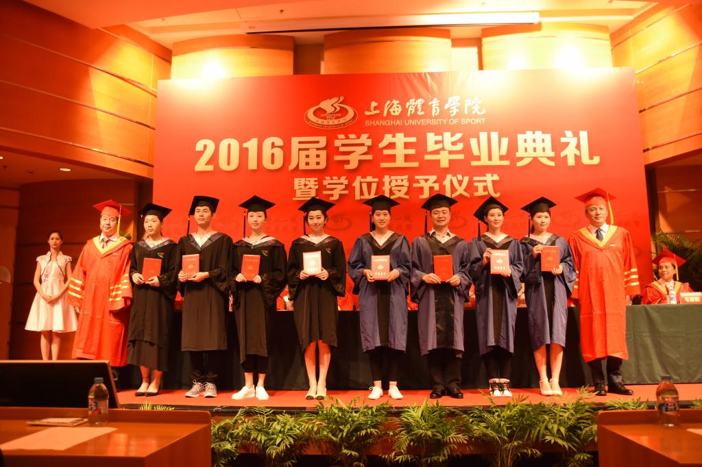 副院长毛丽娟在毕业典礼上宣读了“关于表彰2016届上海市优秀毕业生及上海体育学院优秀毕业生的决定”,党委副书记、副院长陈晓峰,副院长平杰向上海市优秀毕业生代表颁发了荣誉证书。副院长施之皓、王兴放分别向毕业生代表颁发毕业证书。院长陈佩杰教授向毕业生代表颁发了学位证书。