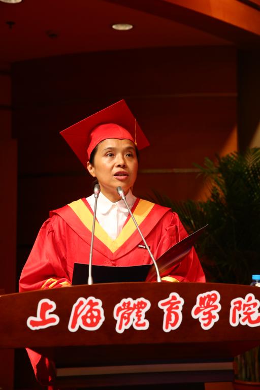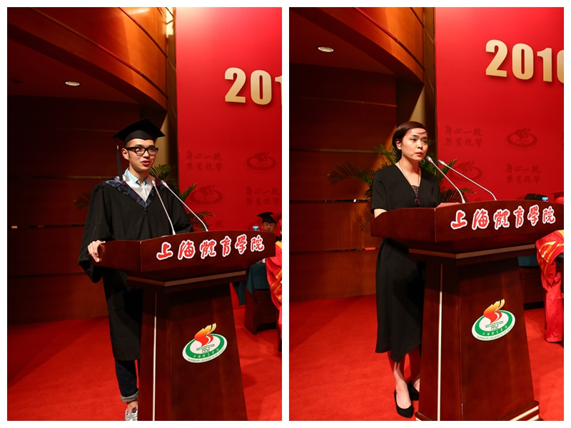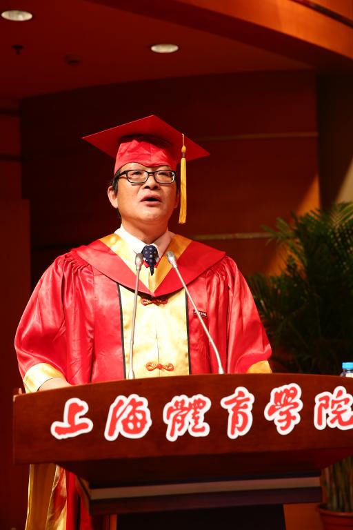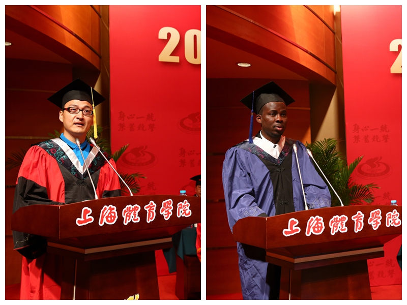 来自经管学院的陶政彦代表毕业生发表毕业感言。他在发言中回忆了自己在上海体育学院度过的四年快乐时光,表达了对母校、对老师以及对家长的感激之情。来自加纳共和国的Eric代表留学生发言。Eric表示,自己在中国及上海体育学院的四年是自己人生中的宝贵财富,感谢学校老师对他的照顾,回国后,他将要把在中国的所学传播到自己的国家甚至全世界,Eric还呼吁越来越多的留学生来中国学习。来自体训学院的高炳宏老师作为教师代表发言,表达了对全体毕业生的美好祝愿,希望毕业生要树立终身学习的理念,要有准确的自我定位,学会感恩。运科学院王子同学的母亲查健女士作为家长代表发言,她在发言中对学校给予学生们几年来的培养表示衷心的感谢,也祝愿上海体育学院办学事业取得更大的发展。