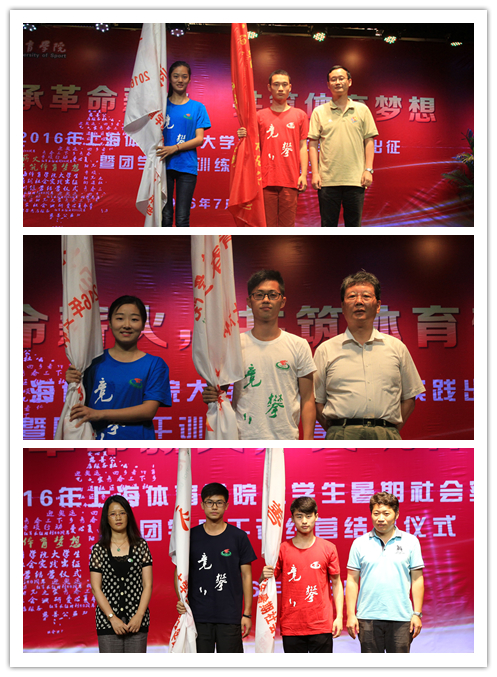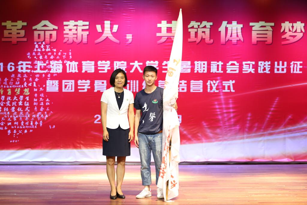 本网讯 7月8日下午,2016年上海体育学院大学生暑期社会实践出征暨团学骨干训练营结营仪式在学生活动中心小剧场举行。上海体育学院副院长毛丽娟出席活动,向学生代表授总旗、宣布出征并做重要讲话。