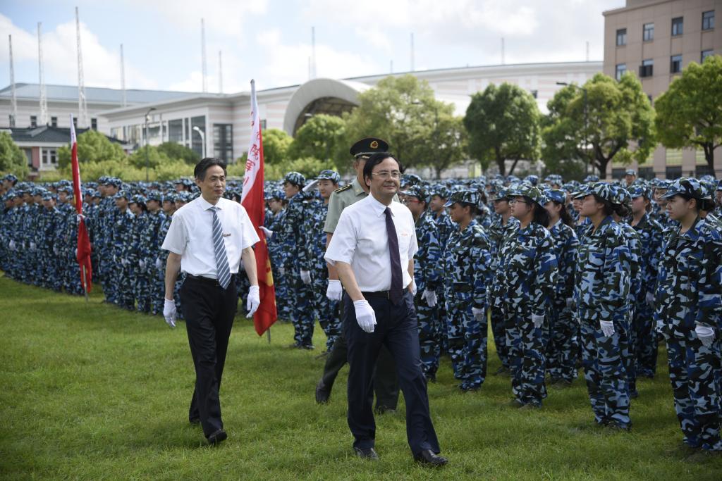 在《中国人民解放军军歌》的音乐声中,团旗迎风飘扬。党委书记戴健,党委副书记、副院长陈晓峰以及军训团团长汝甲对所有参加阅兵式的队伍进行检阅,检阅完毕,各支队伍开始分列式表演。仪仗队作为分列式的第一个方阵,英姿挺拔,步伐矫健,展现了“上体最强音”的风采。随后上场的是口号响亮、精神饱满的各支连队,绿瓦学子迈着整齐的步伐经过主席台前,以昂扬的斗志接受领导的检阅。