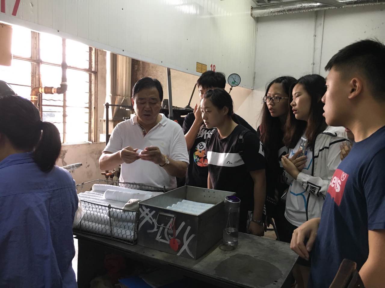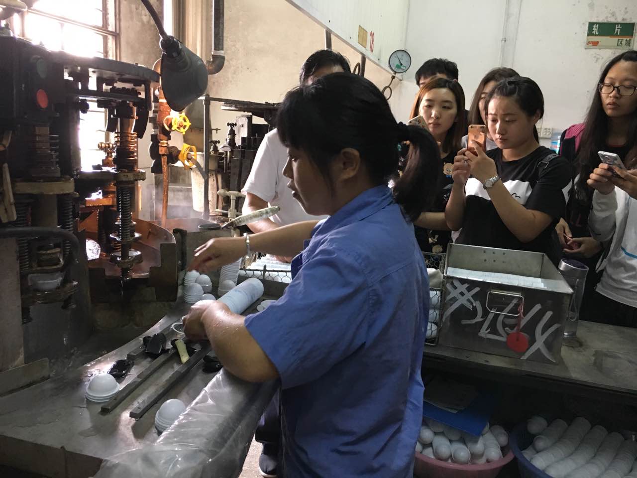 首先大家参观的是乒乓球的制作过程。小小乒乓球的制作分成了很多步骤,从把0.8mm的赛璐璐薄片挤压成一个碗装体,到膨球,到切片,到粘合成球,再到测量球的直径、硬度、重量、球心,来判断是否合格,符合几星球的标准,再到最后的打印商标。在参观过程中,杨总亲自介绍并演示,还会对同学们关心的问题作出耐心的解答。
