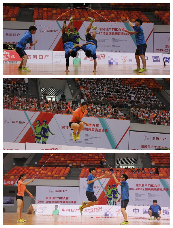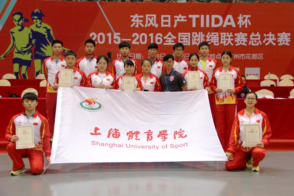本网讯 7月8日至12日,由国家体育总局社会体育指导中心、中国大学生体育协会、中国中学生体育协会联合主办的2016年全国跳绳联赛总决赛在广州花都东风体育馆隆重举行。我校花样跳绳院队14名队员以休艺学院刘树军副院长为领队,以韩耀刚为教练经过3天的激烈角逐,在速度赛中获得6枚金牌(30秒单摇、30秒双摇、4x45秒交互绳接力男子组、4x45秒交互绳接力女子组4、x30秒单摇接力、连续三摇跳),在花样赛中获得6枚金牌(个人花样、两人同步、四人同步、三人交互、四人交互、两人车轮),共计12枚金牌。