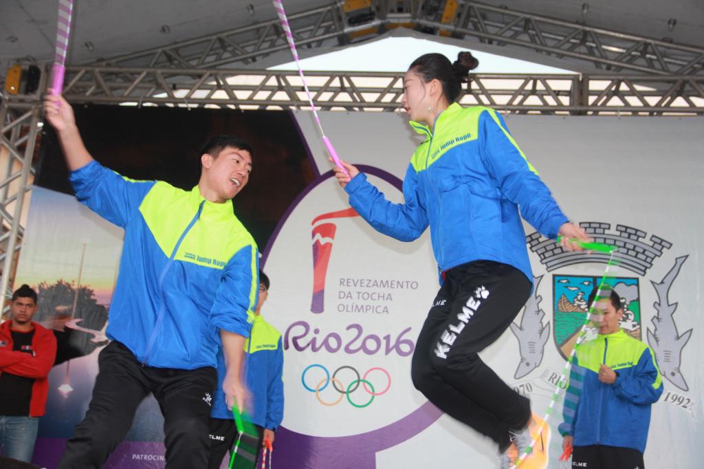 本网讯 巴西里约时间8月1日清晨,奥运圣火来到巴西里约热内卢州(Rio de Janeiro)里约达斯奥斯特拉斯(Rio Das Ostras),韩耀刚老师带领7名队员作为唯一特邀国际演出团队参加了奥运火炬传递开幕式表演。经过精心编排,为现场的几千名巴西观众展现了一套时长近6分钟的演出,花样跳绳中融合了巴西特色桑巴舞蹈、中国功夫、京剧音乐、中国轮(Chinese Wheel)等众多元素,引起现场雷鸣般的掌声和啧啧称赞。