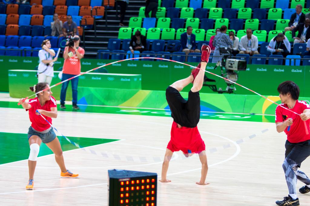 本网讯 巴西时间8月6日至8日三天,上海体育学院花样跳绳队携手上海跃动跳绳俱乐部及巴西跳绳世界冠军VIVIEN共同组成的奥运跳绳表演队由韩耀刚老师带队,在篮球比赛、手球比赛、击剑比赛中场成功演出10场,展示了五套不同风格及元素的节目,队员们激情高涨、活力四射,眼花缭乱的绳技融合巴西元素(桑巴舞)及中国元素(武术、京剧、中国车轮等)于一体,精彩的表演博得现场观众热烈的掌声和欢呼声。