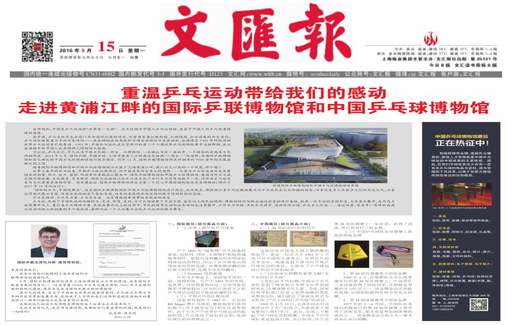 本网讯 8月15日,《解放日报》、《文汇报》分别以专栏形式刊登了国际乒联博物馆和中国乒乓球博物馆(简称“乒博馆”)建设背景、国际乒联主席托马斯先生贺信、展馆内部分藏品介绍、藏品征集公告和上海体育学院院长陈佩杰署名文章——《从瑞士雷蒙湖到中国黄浦江——国际乒联博物馆立足中国向世界推广乒乓文化》。