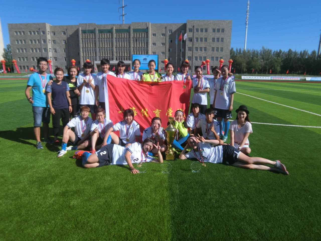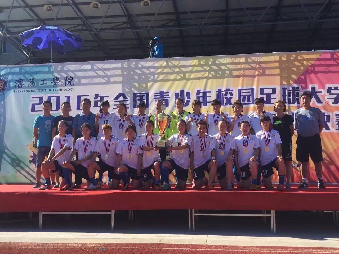 本网讯 8月14日,为期九天的2016年全国青少年校园足球大学联赛(高水平女子组)总决赛在沈阳工学院落下帷幕,经过激烈角逐,我校女子足球队脱颖而出获得本次比赛高水平组冠军,同时主教练叶志竞被组委会授予“最佳教练员”称号、运动员杨雅倩和汤晨燕分别被授予 “最佳运动员”和“最佳守门员”称号。