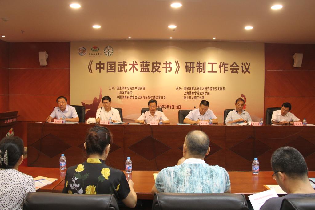本网讯 9月2日,来自全国23个省(市、自治区)35家单位61名专家齐聚上海体育学院召开《中国武术蓝皮书》研制工作会议。本次会议由国家体育总局武术研究院、上海体育学院和中国体育科学学会武术与民族传统体育分会共同主办,由国家体育总局武术研究院研究发展部、上海体育学院武术学院和蔡龙云大师工作室承办。上海体育学院党委副书记王玉林,国家体育总局武术研究院研究发展部副主任王立峰,《中国武术蓝皮书》顾问邱丕相、虞定海,武术学院党总支书记霍圣录,副院长张云崖,副院长、副书记程华出席本次会议。会议由武术学院院长戴国斌主持。