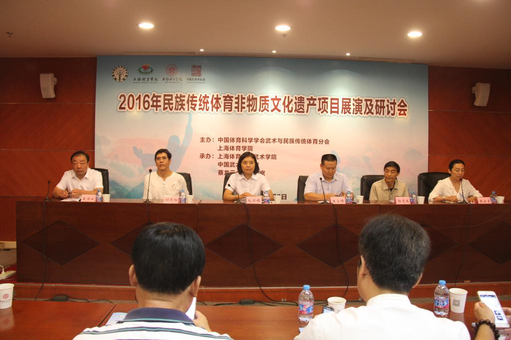本网讯 9月3日,2016年民族传统体育非物质文化遗产项目展演及研讨会在我校举行,来自全国高校和国家级非遗项目的近百位专家学者参加活动。本次活动由中国体育科学学会武术与民族传统体育分会和上海体育学院主办,上海体育学院武术学院、中国武术博物馆、蔡龙云大师工作室联合承办。学院副院长毛丽娟、国家体育总局武术研究发展部副主任王立峰、学院邱丕相教授、郭志禹教授,武术学院院长戴国斌、党总支副书记副院长程华,中国武术博物馆副馆长王震出席研讨会开幕式。会议由武术学院副院长张云崖主持。