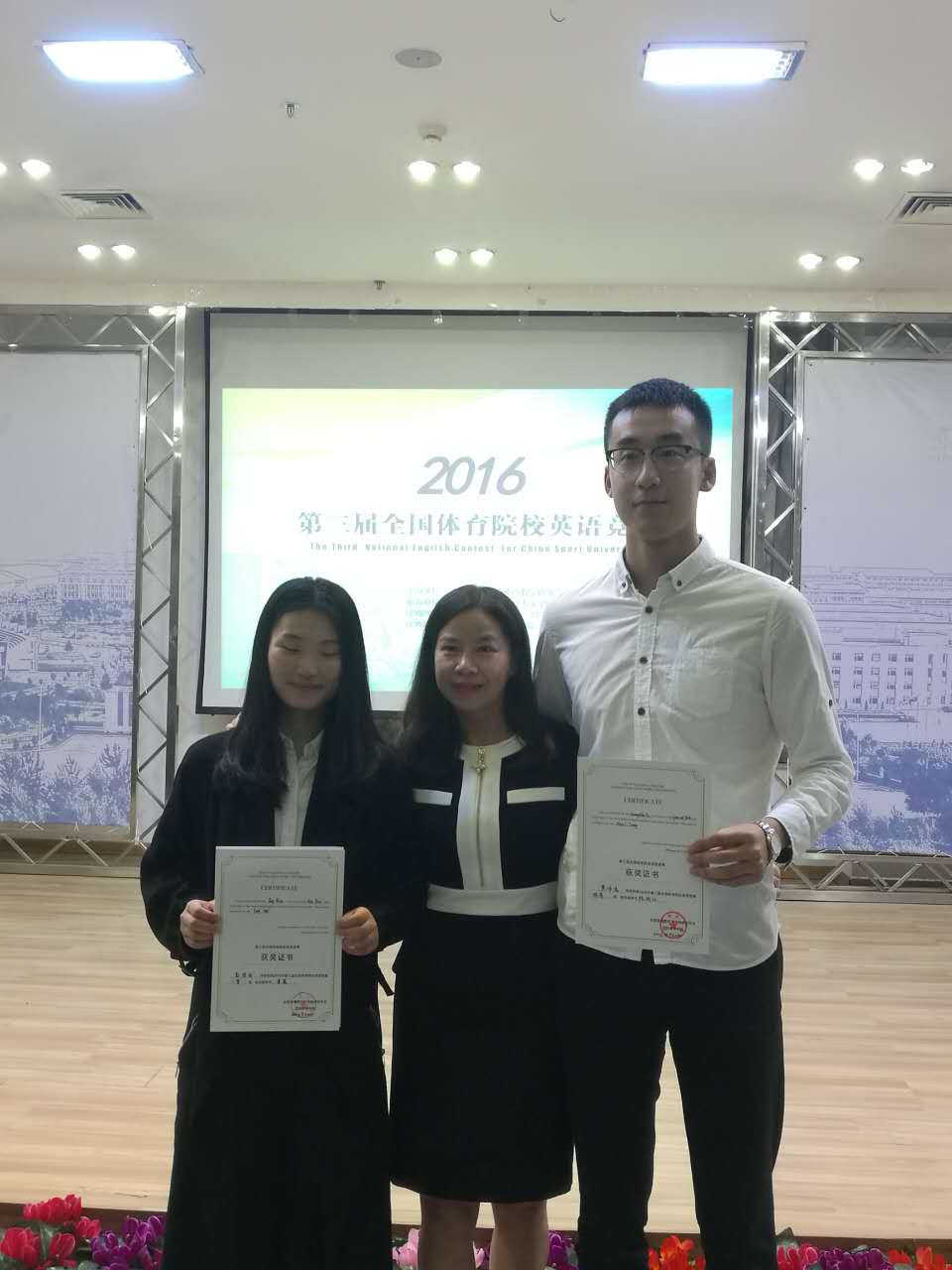 本网讯 2016年9月24日,“第三届全国体育院校大学生英语演讲比赛”在沈阳体育学院如期举行。经过与其他十几所全国体育院校优秀选手激烈角逐之后,我校2015级英语专业黄伟禹同学和2014级新闻专业彭诗雨同学分别斩获英语专业组第一名(特等奖)和非专业组第三名(一等奖)的骄人成绩,指导老师陈丽江也荣获“优秀指导老师奖”。