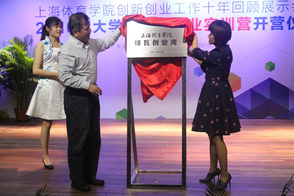 上海体育学院副院长王兴放与中国(上海)创业者公共实训基地管理服务中心主任江烨为“绿瓦创业湾”揭牌。这也是我校对2011年建成的大学生创业孵化中心空间拓展与功能升级项目。