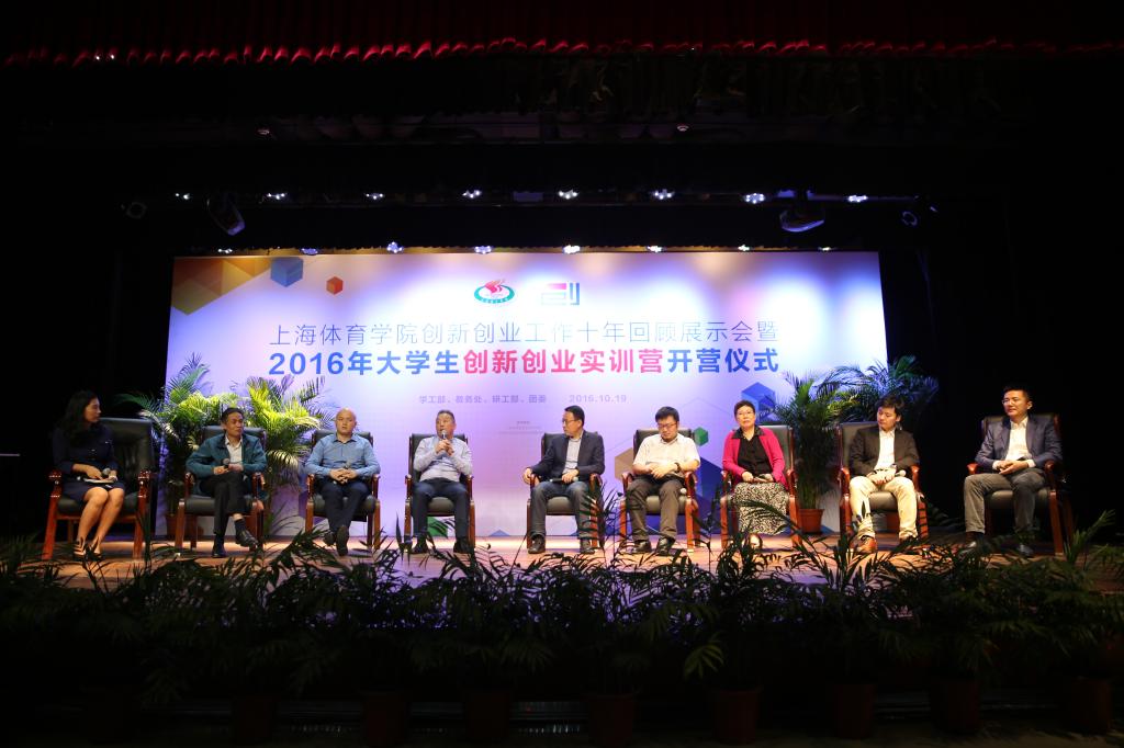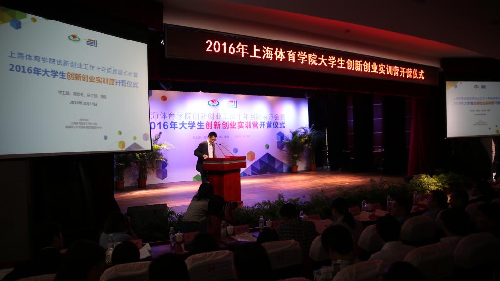本网讯 10月19日下午,上海体育学院创新创业工作十年回顾展示会暨2016年大学生创新创业实训营开营仪式在上海体育学院学生活动中心小剧场举行。上海体育学院院长陈佩杰,党委副书记、副院长陈晓峰,副院长王兴放,以及相关职能部门负责人、二级学院党政领导出席活动,中国(上海)创业者公共实训基地管理服务中心主任江烨、副主任刘俊峰,复旦科技园创业中心副总经理童华以及来自十六位来自投资界、企业界、体育界创业导师应邀出席了开营仪式。仪式由学工部部长熊小健主持。