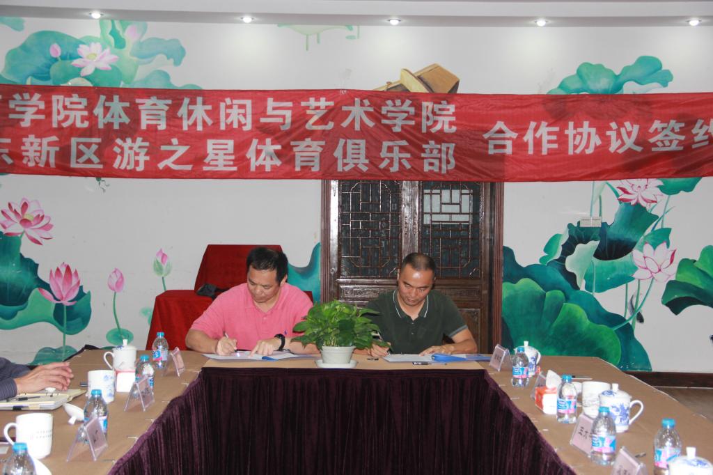 在众人的见证下,休艺学院副院长刘树军和游之星俱乐部金雪春理事长在协议上正式签约;休艺学院党总支书记刘明生为游之星体育俱乐部课程实践基地授牌。仪式结束后,全体人员到游之星俱乐部各场馆参观并进行了交流。