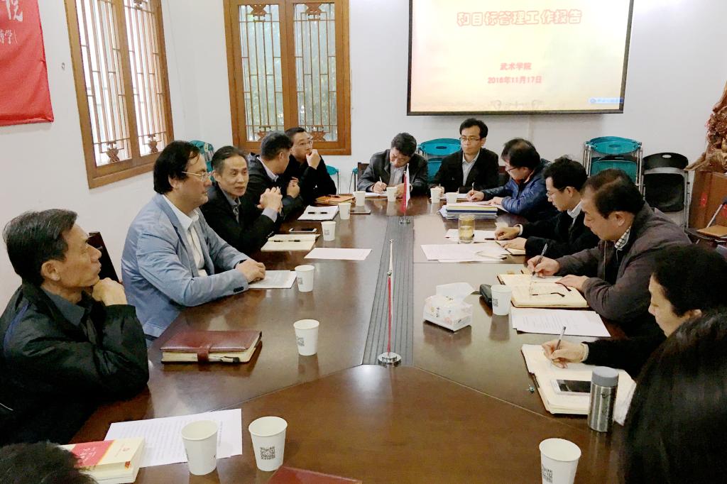 本网讯 为进一步加强对“两学一做”学习教育的督促检查,夯实党建工作基础,进一步完善优化我校目标管理考核体系,发挥目标管理考核对学校各项工作的激励和推动作用,按照市教卫工作党委《关于对系统各单位“两学一做”学习教育进行督导的通知》要求和我校党委部署,学校启动了新一轮“两学一做”督查和目标管理专项调研工作。11月17日上午,由党委书记戴健带领的调研小组赴武术学院召开了专题调研座谈会,党委副书记、副院长陈晓峰,党委副书记王玉林陪同调研,武术学院党政领导班子、基层教研单位负责人、组织、人事、教务、发展规划、研工、学工等职能部门负责人参加座谈,会议由陈晓峰主持。