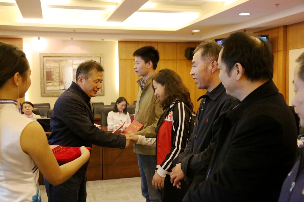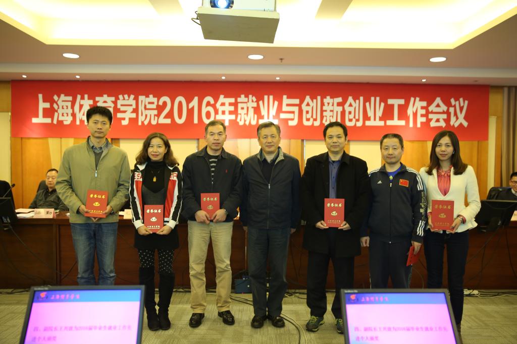 大会对22位获得2016年就业工作先进个人荣誉称号的教师进行了表彰,毛丽娟宣读了表彰决定,王兴放为获奖教师代表颁奖,武术学院邵寅强、新外学院陈丽江等6位老师作为获奖代表上台领取表彰证书,并合影留念。