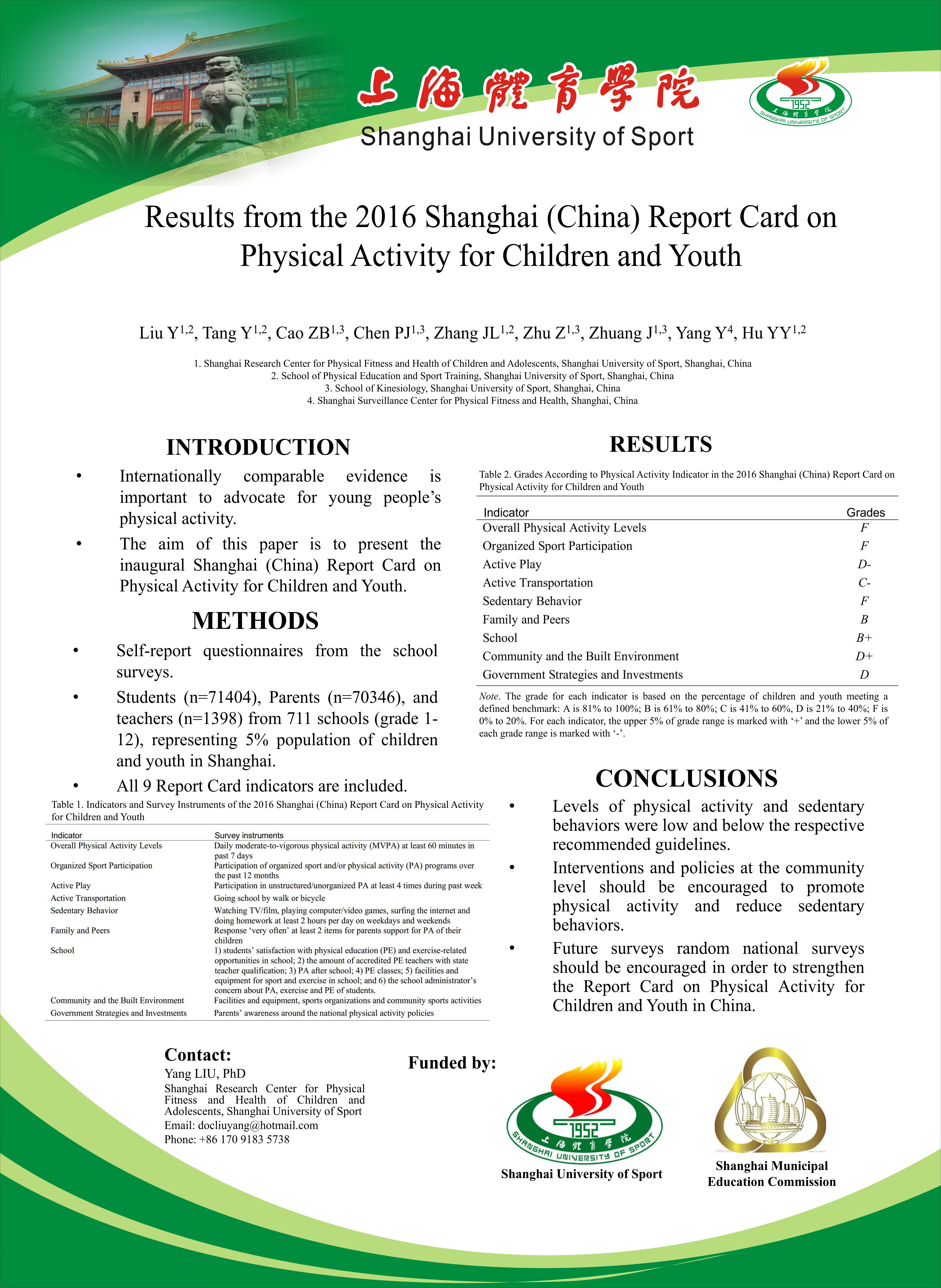 上海体育学院上海市学生体质健康研究中心作为Global Matrix 2.0中国大陆地区唯一的代表机构,以校长陈佩杰教授领衔的研究团队自2014年10月起,承担了首次中国(上海)报告卡的问卷设计、调研、数据整理及研究报告的撰写发布。同时,该报告卡的结果发表在Journal of Physical Activity & Health(SCI期刊),这也是我国体育类院校首次在国际上报道基于大样本数据的我国儿童青少年身体活动情况。本月初,以陈佩杰教授为首席专家的研究团队所申报的《中国儿童青少年体育健身大数据平台建设研究》,获得了2016年度国家社科基金重大项目立项。此外,近期受教育部委托,我校还承担了全国学生体质健康监测复核问卷调研工作。这些都彰显了在健康中国2030的国家战略下,我校儿童青少年身体活动与健康领域研究在国内体育类院校的领先地位。