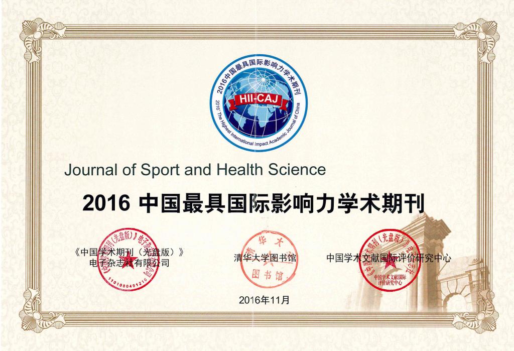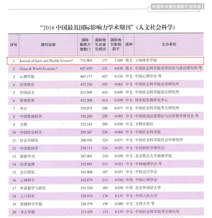 论坛发布了《中国学术期刊国际引证年报》(2016版),公布了“2016中国最具国际影响力学术期刊”名单。上海体育学院主办的《运动与健康科学(英文)》继2015年获得中国人文社科期刊“第一”和“2015中国最具国际影响力学术期刊”称号后,今年再接再厉,在2165种中国人文社科期刊中再次排名第一,同时获得“2016中国最具国际影响力学术期刊”称号。