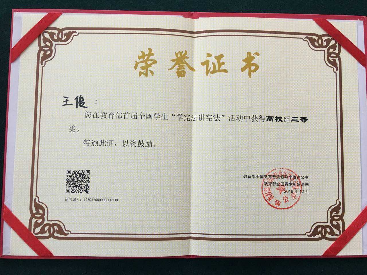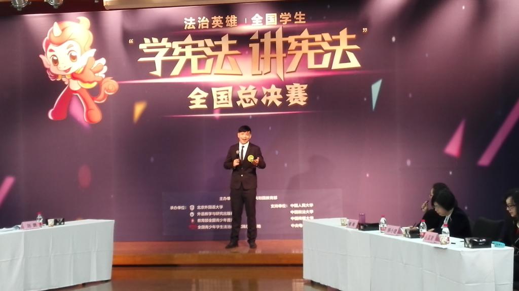 本网讯 11月27日,由国家教育部主办的首届“学宪法、讲宪法”演讲比赛全国总决赛在北京举行,来自全国各省(市、自治区、特别行政区、建设兵团)的冠军共赴北京,同场角逐,决出各组别全国总冠军,我校新外学院2014级播音班王俊同学作为上海高校组冠军参加决赛,并最终获得了全国三等奖的好成绩,司长强老师获得优秀指导教师称号。