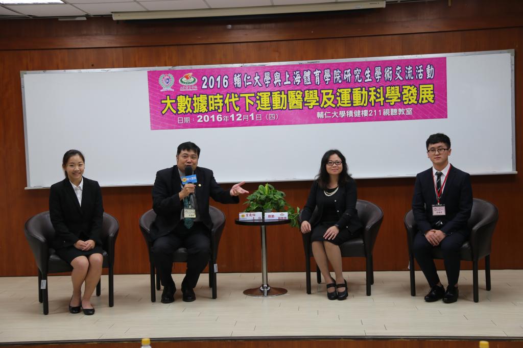 1日下午,我校代表团与辅仁大学体育学系师生以“大数据时代下运动医学及运动科学发展”为主题开展学术交流,交流活动由辅仁大学体育学系主任曾庆裕主持,我校武术学院教授刘静作了“太极拳运动对卒中后患者功能康复的作用及机制研究”专题报告,辅仁大学体育学系研究员李柏甫、讲师黄钵登、助理教授柯明辰分别作了专题演讲,在访谈交流环节,司虎克教授围绕他本人的研究领域与辅仁大学体育学系的教师开展了热烈交流,研究生们也围绕各自的研究领域进行了进一步交流。