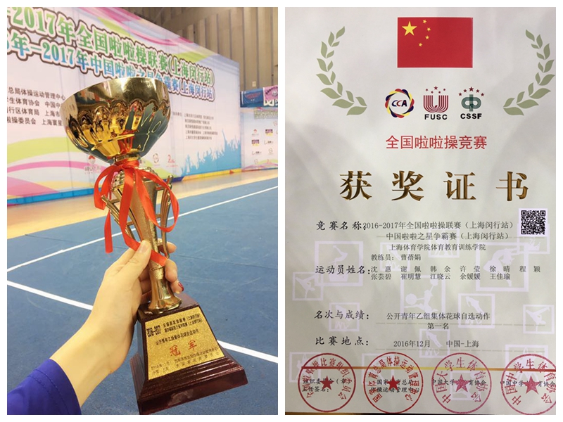 本网讯 12月8—11日,“2016-2017年全国啦啦操联赛(上海闵行站)比赛”在闵行体育馆隆重举行。此次比赛规模庞大,有来自中国各省市的121支队伍参赛,运动员共达2710名。上海体育学院代表队是由体育休闲与艺术学院曹蓓娟老师为教练兼领队,以及体育教育训练学院2015级硕士研究生崔明慧、谢佩、程颖、韩余、沈惠、许莹、江晓云、张芸碧、余媛媛、徐晴、王佳瑜11位学生组成,获得了“全国啦啦操联赛—公开青年乙组集体花球自选动作”第一名的好成绩,并收到了参加国际啦啦操赛事的派遣函。