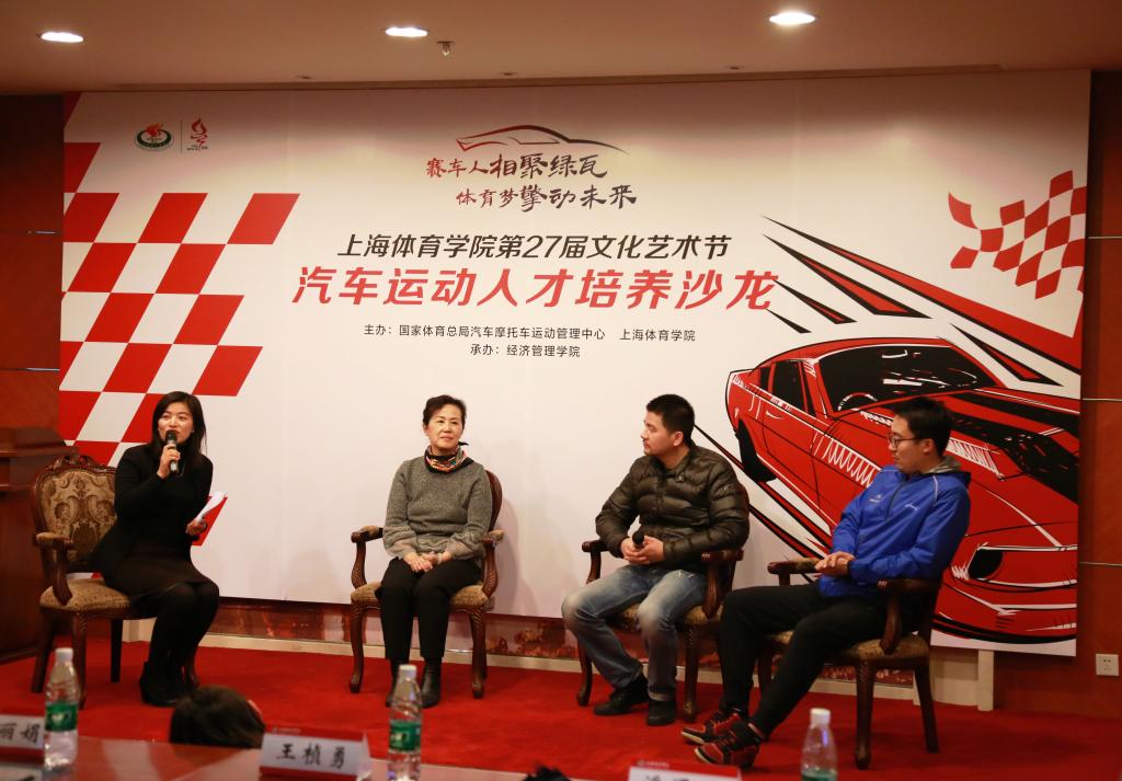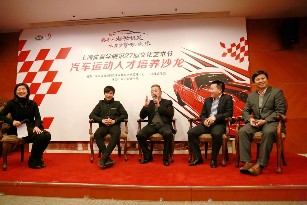上海市汽摩协会副秘书长王桢勇,上海力盛赛车文化股份有限公司副总经理张国江,久事赛事营销中心副总经理、F1评论员潘湧湧,五星体育广播副总监、五星体育广播车队发起者兼车手雅东,乐视体育上海地区负责人张玉泰,中国第一个F1车手马青骅,我校体育管理教育专家以及全校师生代表参加了此次沙龙研讨。
