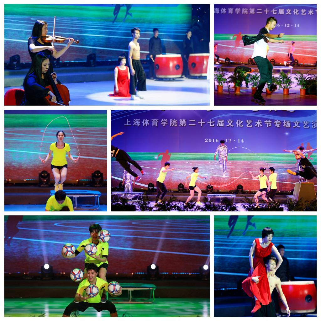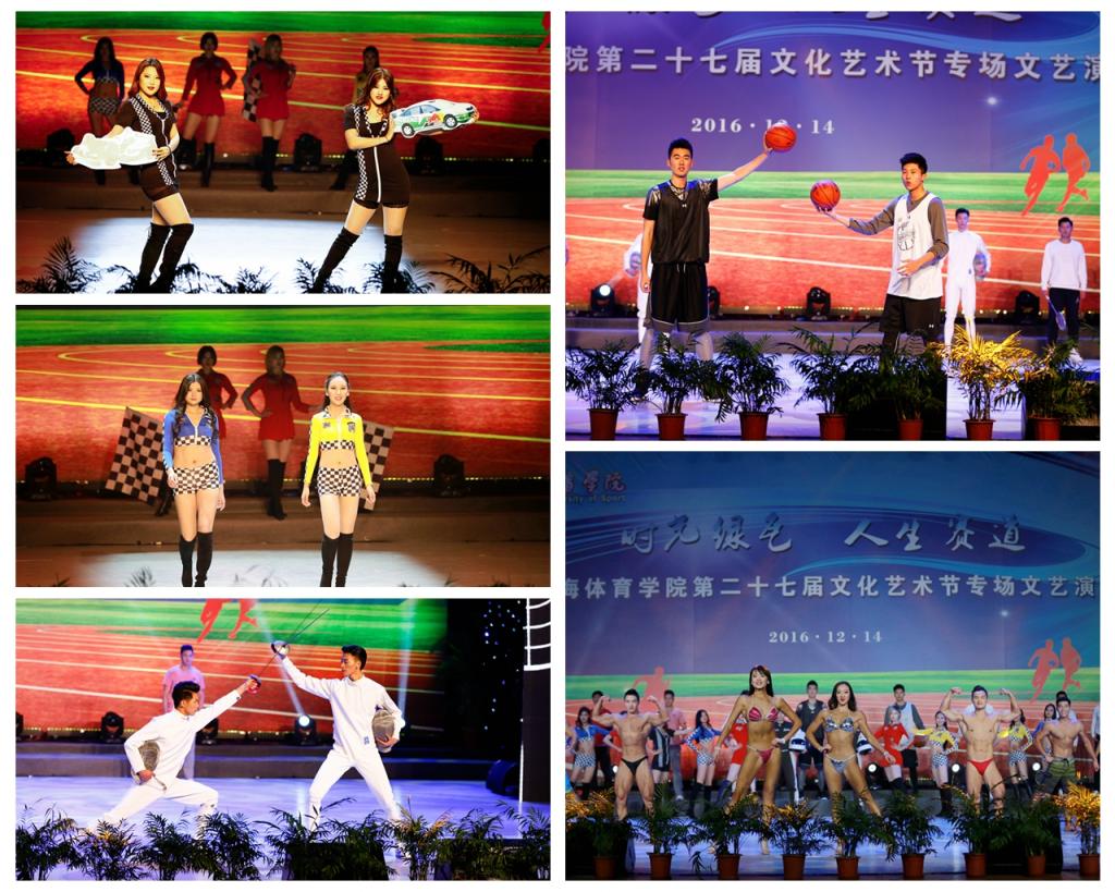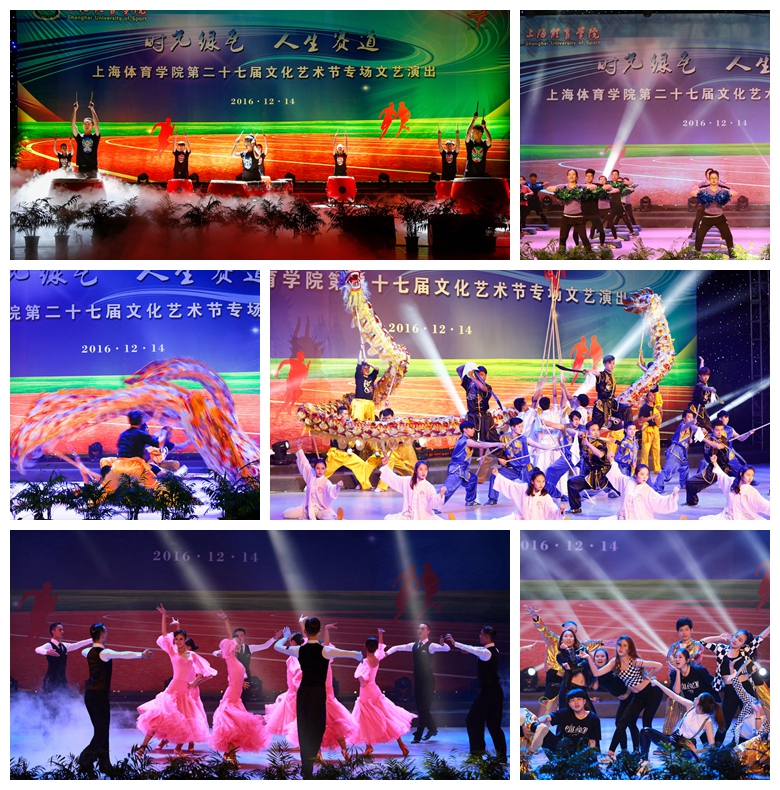 休艺学院带来激情洋溢的开场踏板操《热力青春》,他们的体育舞蹈《舞步青春》将青春与激情融合一起;武术学院的武术节目《精武》,展现了中华武术的张力和体育的精神,高难度的舞龙动作将武术竞技动作糅合其中;而学生乐团带来的打击乐表演《鼓乐狂想》,引燃了全场气氛,CPS街舞社的街舞《Up!up!up!》,带给大家的则是活力与魅力。体育学院、模特社的《速度与激情》将体育元素以模特与健美完美地展示出来,将晚会气氛推向巅峰;武术教师刘志贤的男声独唱《永不回头》唱出了绿瓦学子竞攀的精神和对于体育的坚持,新外学院的音诗画节目《竞攀路上》介绍了高磊、胡建关、张新艳等绿瓦奥运健儿在竞攀路上的心路历程,博得掌声一片。