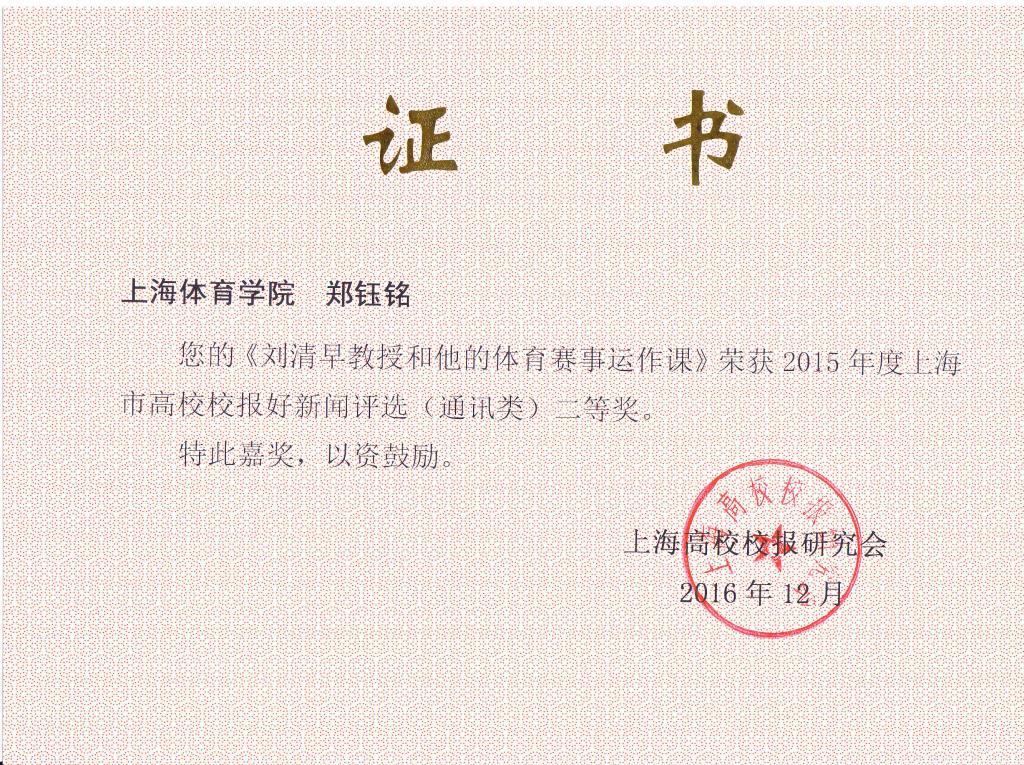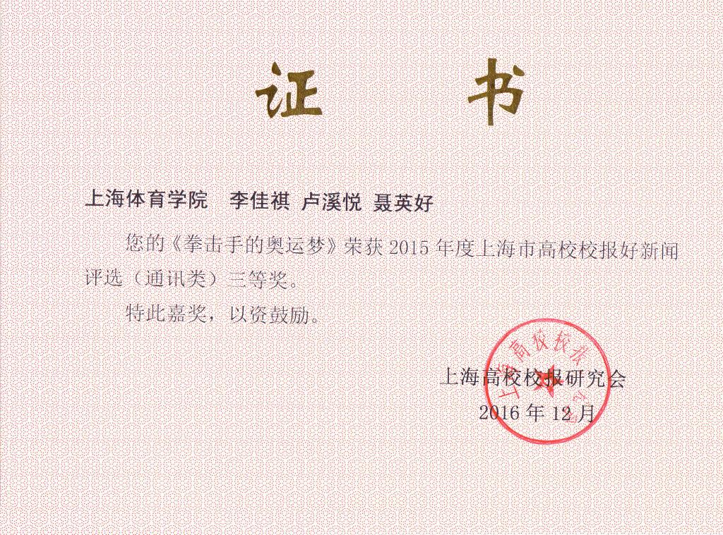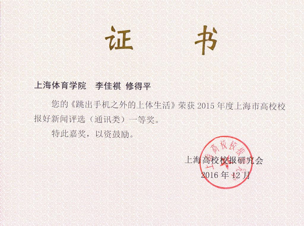 由李佳祺、修德平撰写的《跳出手机之外的上体生活》荣获通讯类一等奖,由郑钰铭撰写的《刘清早教授和他的体育赛事运作课》荣获通讯类二等奖,由李佳祺、卢溪悦、聂英好撰写的《拳击手的奥运梦》荣获通讯类三等奖。由董杨华制作的新闻和版面荣获消息类和版面类两个二等奖。