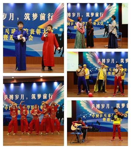 表彰之后,由青少年队带来的舞蹈《The catch up》拉开了晚会的序幕。来自2016级的本科生高蒙涛为大家带来了歌曲《遥远的她》;由四位研究生表演的《After school》集体舞给大家带来了一股青春气息;青少年队的小朋友们也毫不逊色,给大家带来了小品《魂斗罗》、《唐朝美人》、相声表演、印度舞蹈、歌曲独唱以及吉他小提琴演奏,赢得了阵阵掌声;中乒院本科生还组建了一支乐队,有吉他、贝斯和鼓等乐器,为大家带来了《向阳花》,深受学生喜爱;日本留学生柳桥康斯为大家带来了反串舞蹈《晴天好心情》,惊艳了全场,将晚会推向了高潮。最后压轴节目请来了武术学院的同学们给大家表演《武动乾坤》,更是将全场热情再一次点燃。