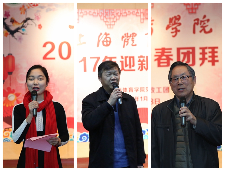团拜会上,党委书记戴健在致词中指出,对于学校事业发展来说,每一年的终点也是新一年的起点。在过去的一年里,通过全体上体人的不懈努力,为上海体育学院这座历经了六十余年发展的新中国第一所高等体育院校注入了新的内涵,开创了新时期、新常态下学校发展的新空间、新愿景,取得了足以令所有上体人感到骄傲与自豪的辉煌成就与发展。成绩的取得来之不易,离不开老领导、老同志们的关心支持和全体师生员工的共同努力。展望2017年,是学校“十三五”重要一年,是抢抓新机遇、迎接新挑战、再攀新高峰的关键之年,学校还将迎来65周年校庆。戴健号召全校师生,一定要做历史的传承者,延续上体六十余年的峥嵘风华,凝心聚力,努力奋斗,描绘“十三五”学校发展更加美好的蓝图;同时,我们处在一个变革的时代,教育综合改革和学校升级发展需要我们开拓思路、勇于创新,成为学校新历史的书写者。讲话的最后,戴健代表学校向全校师生员工致以最热烈的新春问候。