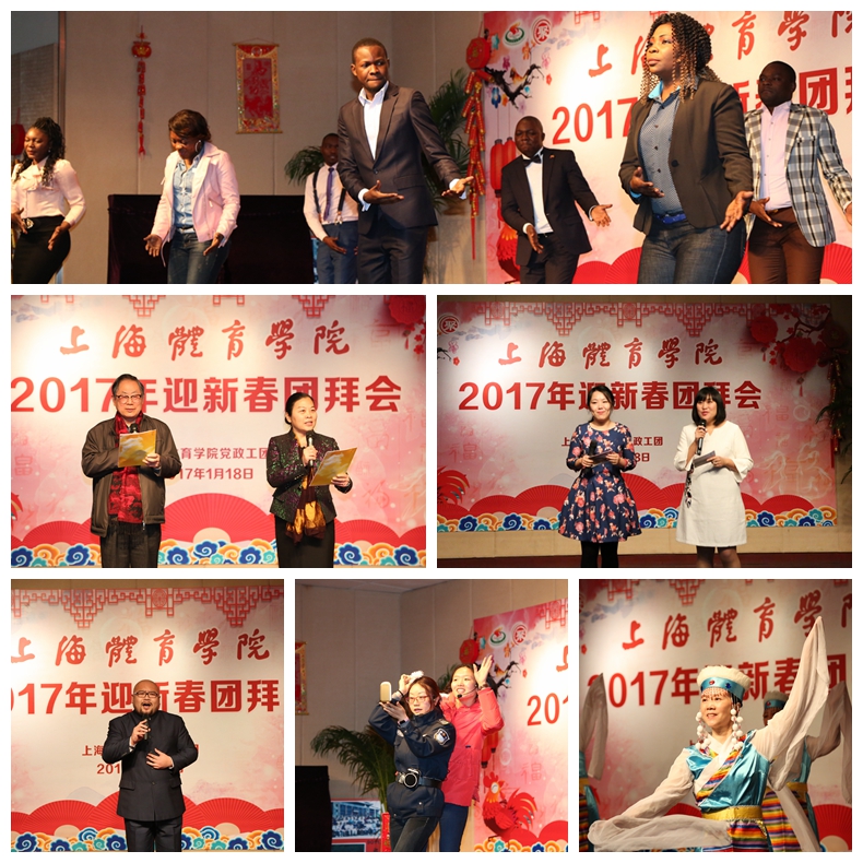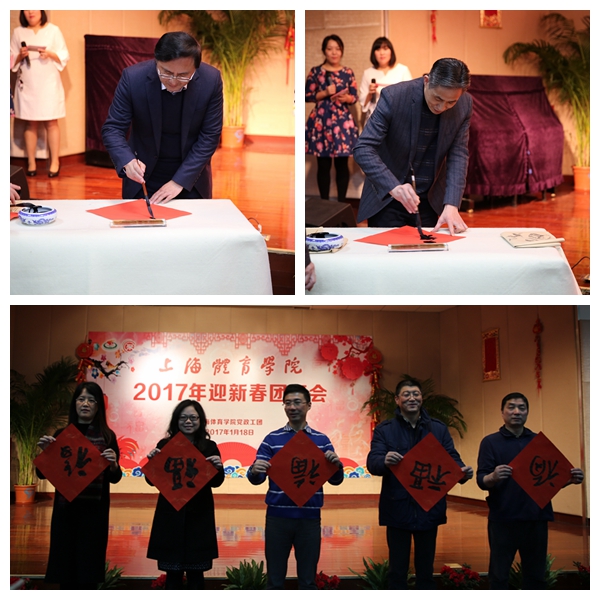 在喜庆祥和的氛围中,大家一同观看了教工文艺爱好者献上的精彩文艺节目。舞蹈《天路》迈出新春不懈奋斗的步伐,朗诵《我们走进新年的畅想》带来春天的期盼,小品《非探视时间》赢得一阵阵欢笑声,留学生的《非洲民族舞》带来异国风情,歌曲《一杯美酒》让与会者回首峥嵘岁月,共同期待中华民族伟大复兴、强大中国梦早日实现。节目的最后,校领导戴健和陈晓峰信笔挥毫,为大家送上新春祝福。五福临门,共祝全校师生员工在丁酉新年里身体健康、工作顺利、阖家幸福、心想事成、吉祥如意!祝福学校改革和事业发展取得更大的成就!