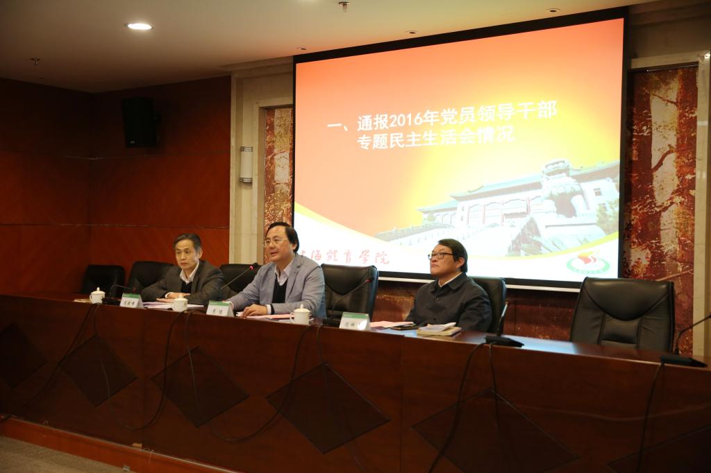 戴健强调,要按照“全面从严治党”的要求,强化党内政治生活,不断提高干部队伍整体素质;要严格遵守党的政治纪律、组织纪律,不断强化政治意识、大局意识、核心意识、看齐意识;要坚持依法治校,坚持贯彻民主集中制,不断提高依法治校、民主治校的能力;要认真落实党委主体责任,深入推进党风廉政建设;要巩固“两学一做”学习教育成果,以更大担当和干劲推进学校事业全面发展。
