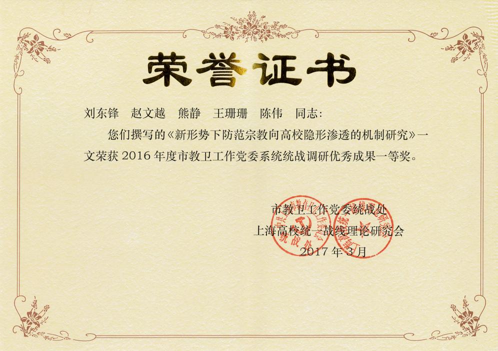 本网讯 3月16日,上海市教卫工作党委系统统战工作会议在上海师范大学召开,会上对2016年度市教卫工作党委系统统战调研优秀成果进行了表彰。由我校经管学院党总支刘东锋、赵文越、熊静、王珊珊、陈伟撰写的论文《新形势下防范宗教向高校隐形渗透的机制研究》获优秀成果一等奖,并获上海市统战系统优秀调研成果二等奖;由民盟黄聚云、晏妮、陈超、吴中晏、徐雯雯撰写的论文《网络宗教问题研究》荣获优秀成果三等奖。