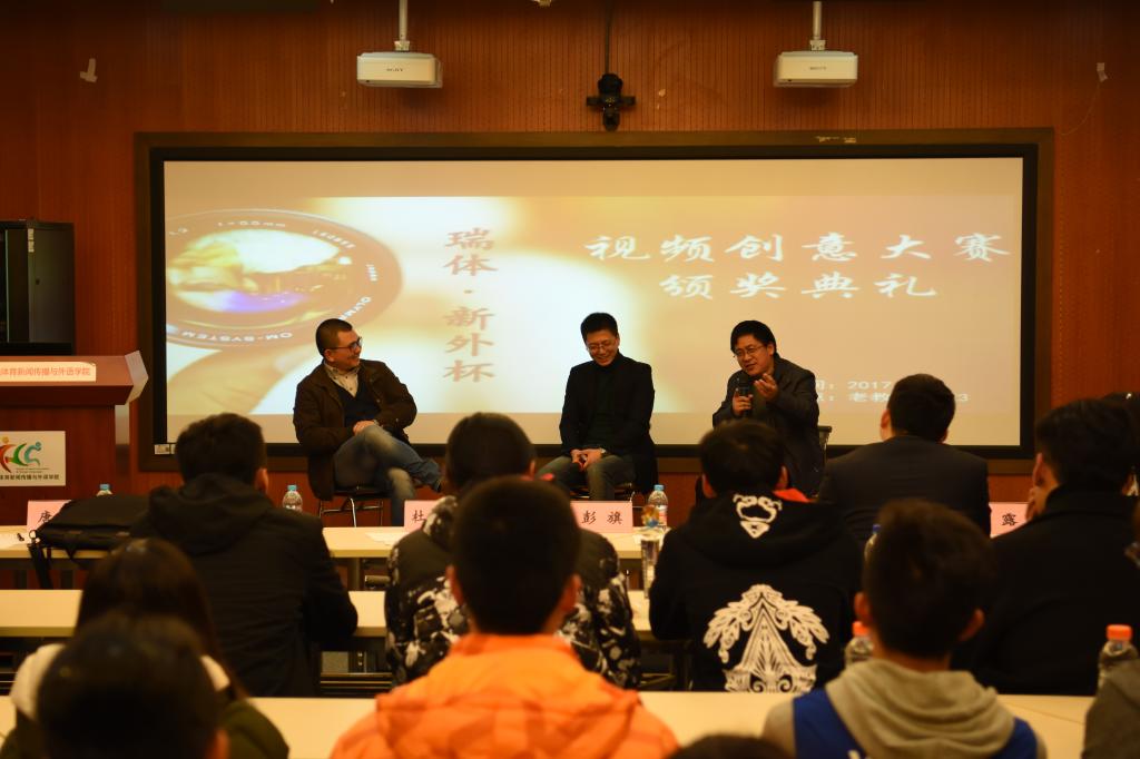 本网讯 3月16日,由体育新闻传播与外语学院、上海瑞体体育发展文化传播有限公司联合举办的第一届“瑞体·新外杯视频创意大赛”在我校老教223落下帷幕。比赛颁出了包括最佳影片奖、最佳创意奖、最佳素材奖等在内的5个奖项。新外学院院长杜友君,党总支副书记、副院长高艳丽,专业课老师唐建军、戴焱淼,上海瑞体体育发展文化传播有限公司首席执行官彭旗、首席技术官韩大安出席此次颁奖典礼。