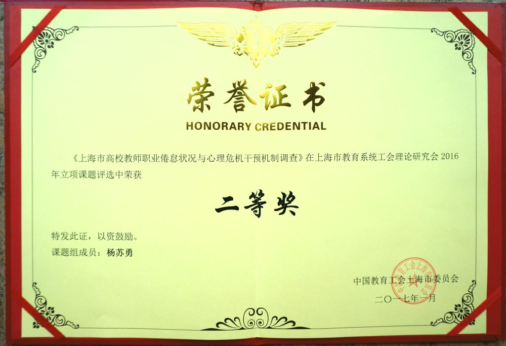本网讯 3月18日,上海市教育系统工会理论研究课题撰写培训会议在上海海事大学港湾校区召开,会上市教育工会宣布了2016年教育系统工会理论立项课题评审结果,并颁发了荣誉证书。我校体育教育训练学院项贤林副教授领衔主持的《上海市教育工会市级体育竞赛体系创新研究》课题获得理论研究一等奖,运动科学学院杨苏勇副教授主持的《上海市高校教师职业倦怠状况与心理危机干预机制调查》课题获得二等奖。