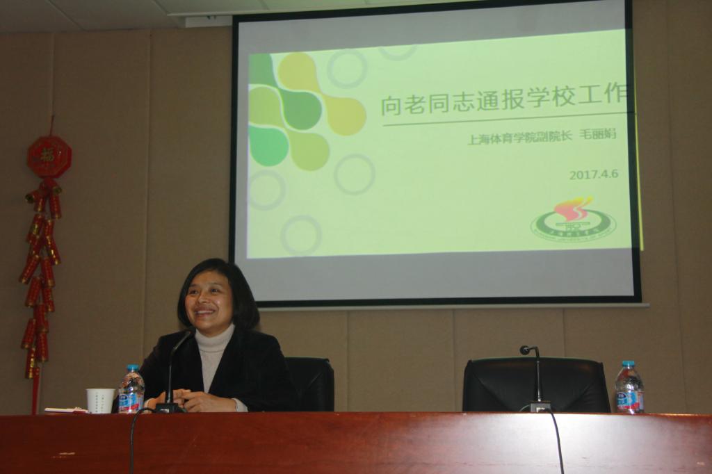 毛丽娟副院长主要介绍了2016年学校工作取得的成绩和今年工作的重点。她首先谈了学校“十三五’发展的总目标,那就是建设世界一流体育大学。这既是学校自身发展的需要,也是国家教育强国战略和上海一流教育建设的客观要求。然后介绍了去年完成的重大专项工作,包括深入开展“两学一做”学习教育,推进党的建设;出色完成“十三五”改革发展规划编制工作;不断深化综合改革;创新推进本科教学激励计划;有效推动高峰高原学科建设和智库建设;大力推进国际乒联博物馆和中国乒乓球博物馆建设等。去年学校在党建、德育、人才培养、学术科研等方面也取得了瞩目的成绩。2017年学校将继续贯彻落实党的十八届六中全会精神,迎接党的十九大和上海市第十一次党代会召开。做好包括建校65周年校庆系列活动的七项重大专项工作。今年的主要工作包括教学科研人才培养推进等。毛丽娟副院长热情邀请在座老同志届时积极参与65周年校庆活动。
