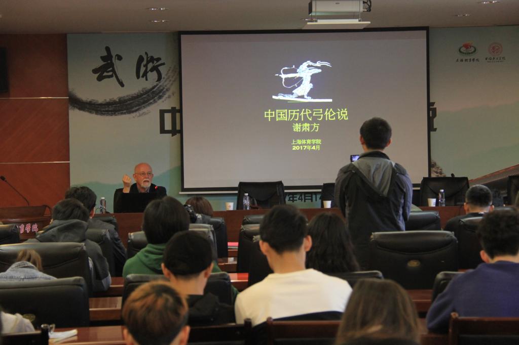 互动环节中,谢肃方教授耐心为武术专业学生以及传统射艺爱好者答疑解惑。回答内容涉及到他研究、收藏中国传统弓箭的初衷;在当今时代中国传统射艺发展面临的问题等等。最后,武术学院院长戴国斌教授从三个方面对谢肃方先生的讲座进行总结,第一谢肃方先生作为英国人,其身上体现出来的学者风范以及对中国传统文化研究造诣之深令人钦佩,进而看到爱丁堡大学人才培养的优秀学风,值得努力建设成为世界一流体育大学的上海体育学院学习;第二,从传统弓精致的制作过程上,提出怎么样对接当代“工匠”精神,研究生学习研究中如何体现 “工匠精神”;第三,我们当代人面对中国传统文化应该怎么样传承。