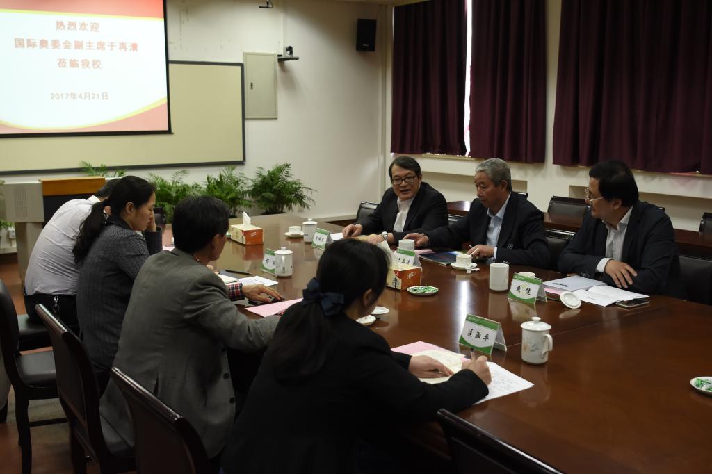 首先,党委书记戴健代表学校致欢迎辞。随后,校长陈佩杰向于再清主席介绍了我校建校以来的基本情况以及近几年来学生培养、师资队伍、学科建设、科学研究、国际化办学等发展情况。陈校长希望在传承民族传统体育、展示中国体育特色等方面与国际奥委会和国际武术联合会能有更多交流合作的机会。对此,于再清主席也非常认可,指出上海体育学院是引领武术研究和人才培养的高地,特别是我校武术表演专业的建设,对于武术文化国际传播与推广具有重要意义。最后双方就未来深入合作领域展开了交流探讨,进一步拓展了未来合作空间及方向。