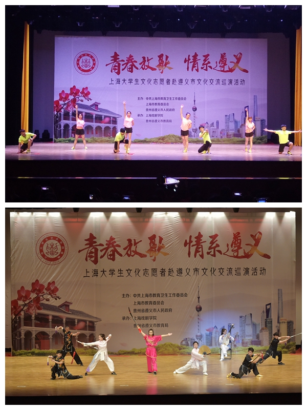 参加此次演出的学生来自上海体育学院、上海音乐学院、上海戏剧学院、上海视觉艺术学院、上海电影艺术职业学院、华东师范大学等六所高校。本次我校由魏巍老师指导的武术表演《蔚然成风》和韩耀刚老师指导的花样跳绳《绳采飞扬》,在遵义第四中学、遵义师范学院、习水县第三中学连续演出三场。在克服了天气与场地等多方面困难后,学生用精彩绝伦的表演带给当地观众们力与美的视听享受,引起了观众们强烈的共鸣,每当谢幕时都引来场下雷鸣般的欢呼与掌声。本次巡演得到上海市教委及遵义市教育局领导的高度评价与赞赏。