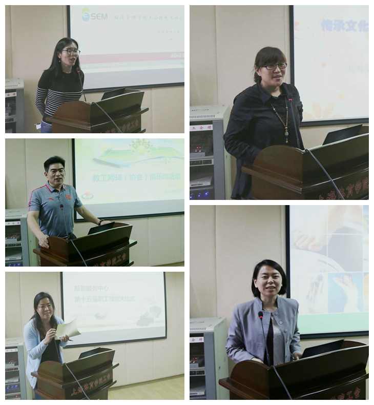 为认真贯彻落实习近平总书记系列重要讲话精神,树立先进典型,在校工会的带领下,基层工会组织涌现出一批具有凝聚力、吸引力、影响力的工会特色工作。后服中心工会的“岗位练兵·培育上体工匠”;经管学院工会的“经管一家亲”;新外学院工会的“传承文化薪火·智慧魅力新外”;教工网球协会的“十年寒暑·一网情深”;教工瑜伽协会的“瑜悦身心”等五个工会特色活动荣获了上海体育学院2017年工会特色工作案例表彰,并在会上做了展示。