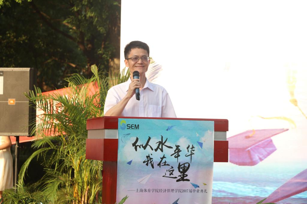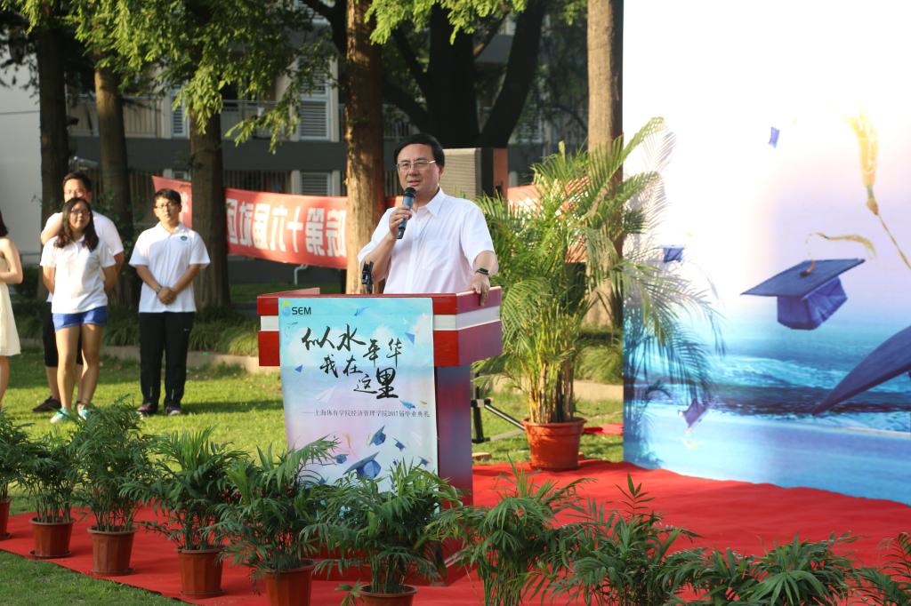 本网讯 6月17日,经济管理学院在宿舍区大草坪举行“似水年华,我在这里”2017届学生毕业典礼。上海体育学院党委书记戴健,经济管理学院院长曹可强,党总支书记刘东锋,党总支副书记、副院长熊静,导师代表和辅导员出席了本次活动。毕业典礼围绕“前程似锦,迎接未来”,“诉说青春,展望未来”,“授业之恩,倾心相报”,“寄语未来,筑梦启航”,“不忘友谊,珍重再见”,表达了浓浓的师生情、同窗情、亲友情。