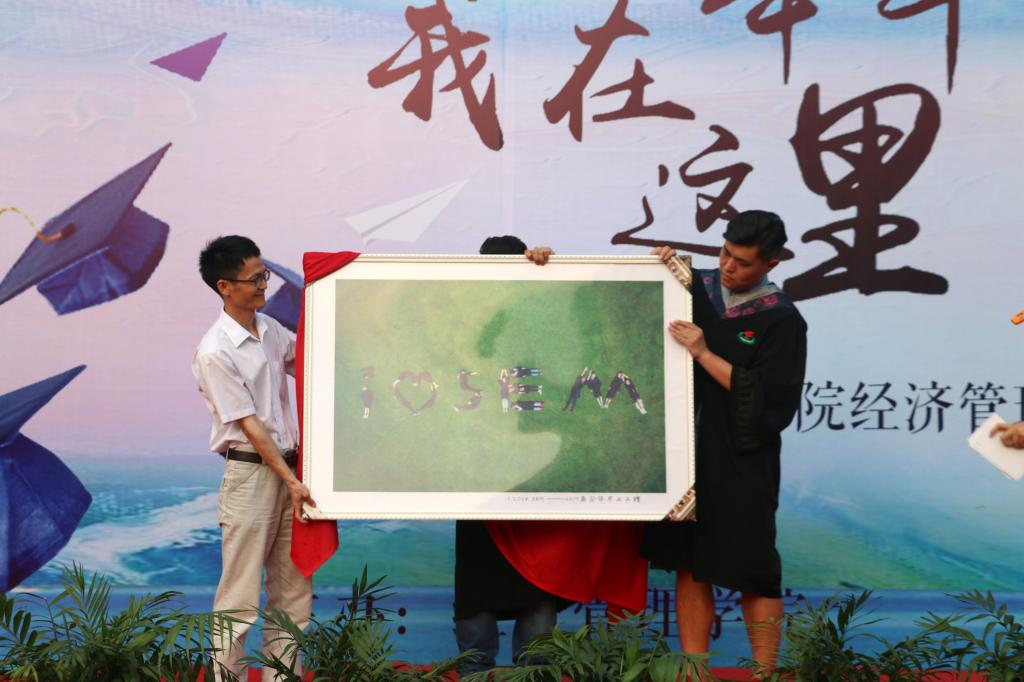 刘东锋、熊静分别宣读上海体育学院优秀毕业生、特色奖名单,并为其颁发证书、拨穗。刘东锋代表学院接受毕业生赠与礼物,一幅“I love sem”的油画作品。 曹可强寄语毕业生,永保初心,脚踏实地,追求卓越;敢于担当,甘于奉献,勇于奋进;豁达乐观,热爱生活,宽容自信。他表示,母校将永远站在他们身后,最诚挚地期待着,也最无私地支持着他们,盼望毕业生们从此刻出发、从这里出发,成为夜空最耀眼的星。