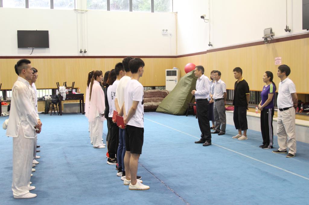 本次世博会参演团队首先进行了节目汇报,陈晓峰对连日刻苦训练的表演团队师生给予了极大肯定,他谈到2017年是特殊的一年,演出活动频繁,需要广大学生参与,需要相关职能部门、各二级学院精心安排。他希望此次世博会演出任务能够圆满的完成,达到国家、及上海市对我们的演出要求。同时他对表演团队提出了殷切希望,希望大家在思想上、行动中从严要求自己,为演出做好充分的准备工作;在节目的编排上要抓好每一个细节,做到精益求精,展现传统武术文化的精气神,展现我校绿瓦学子的精神风貌;出门在外务必注意安全,做到劳逸结合,要有团队意识,遵守团队纪律。